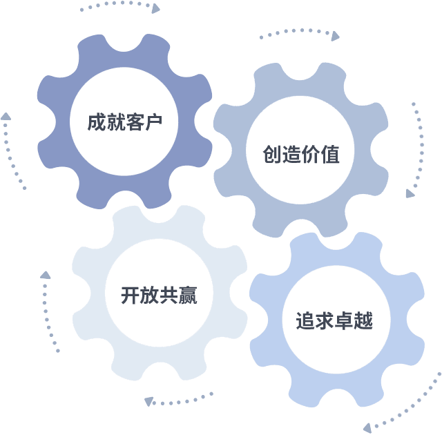 成就客户是一切决策的出发点,,,,创造价值是衡量所有工作的标准,,追求卓越是我们做事做人的态度,,,,开放共赢是我们的格局也是最终的结果。。价值观的齿轮环环相扣,,推动着组织里的每个人不断向前。。