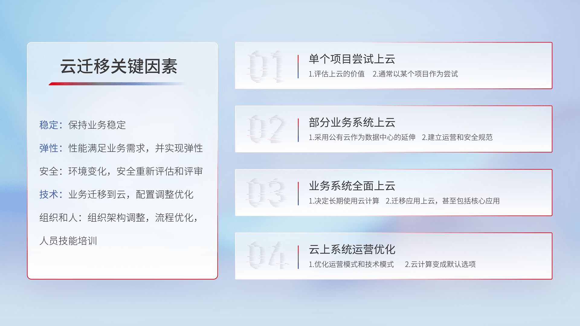 结合实际业务,,,从规划设计、、、云平台选型、、、、云原生改造、、、数据迁移、、集成交付,,,,迁移全过程为客户识别最佳上云路径,,,做好风险识别管理,,,设计网络架构、、、身份权限、、安全审计合规、、操作审计、、、、日志审计、、、、监控告警策略、、、多站点容灾设计等,,,对云上基础设施进行整体规划,,提升IT治理水平,,以满足弹性、、高可用、、、高性能的需求。。。。