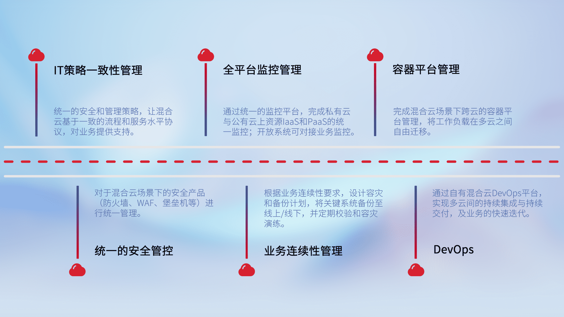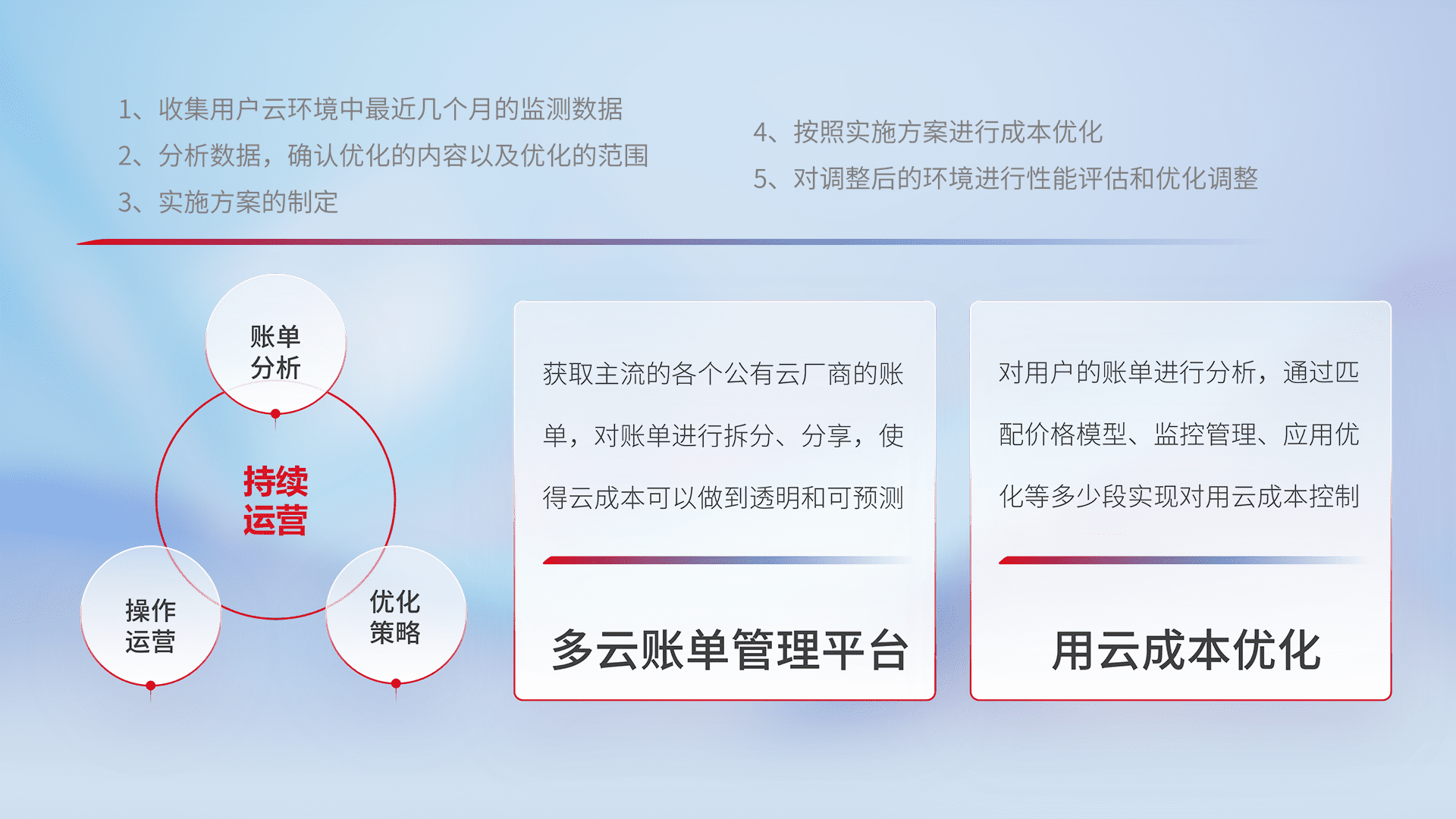 通过多云纳管,,,以统一的资源数据模型把客户的云资源进行抽象和封装,,,进而实现对多云资源的统一操作,,,,保障云资源管理的可靠性、、、、稳定性与可用性。。。。量身定制化运维内容,,配置、、、、开发运维、、补丁管理、、、备份、、、、监控、、、、认证和访问管理、、、、审计和日常巡检等,,保障在用云过程中的可靠度,,,,稳定度以及高可用率。。。